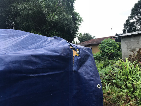 We arrived at World Hope late today due to impedance from the rain. Upon arrival, we found that the roof of our structure had yet again run into problems with the weather. Rainwater had collected in two pockets on the front side of the house and some of the tarp on that side had ripped.